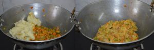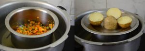 Now let us see how to cook vegetables for cutlet – I kept beans and carrot in a vessel without water, closed it with a lid, kept potatoes on top and pressure cooked for 3 whistles.(see picture below). In this method there will not be much moisture in the vegetables. If you are cooking the vegetables in water, after the vegetables are cooked, drain the water immediately. Squeeze out all the water using a muslin cloth.The important thing to be noted here is that there should not be any moisture in the vegetables. So see to it that you squeeze out all water from the vegetables.