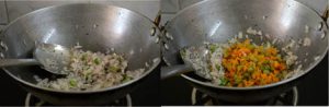 Heat oil in a kadai, add mustard seeds, when it splutters, add finely chopped onions and green chillies.